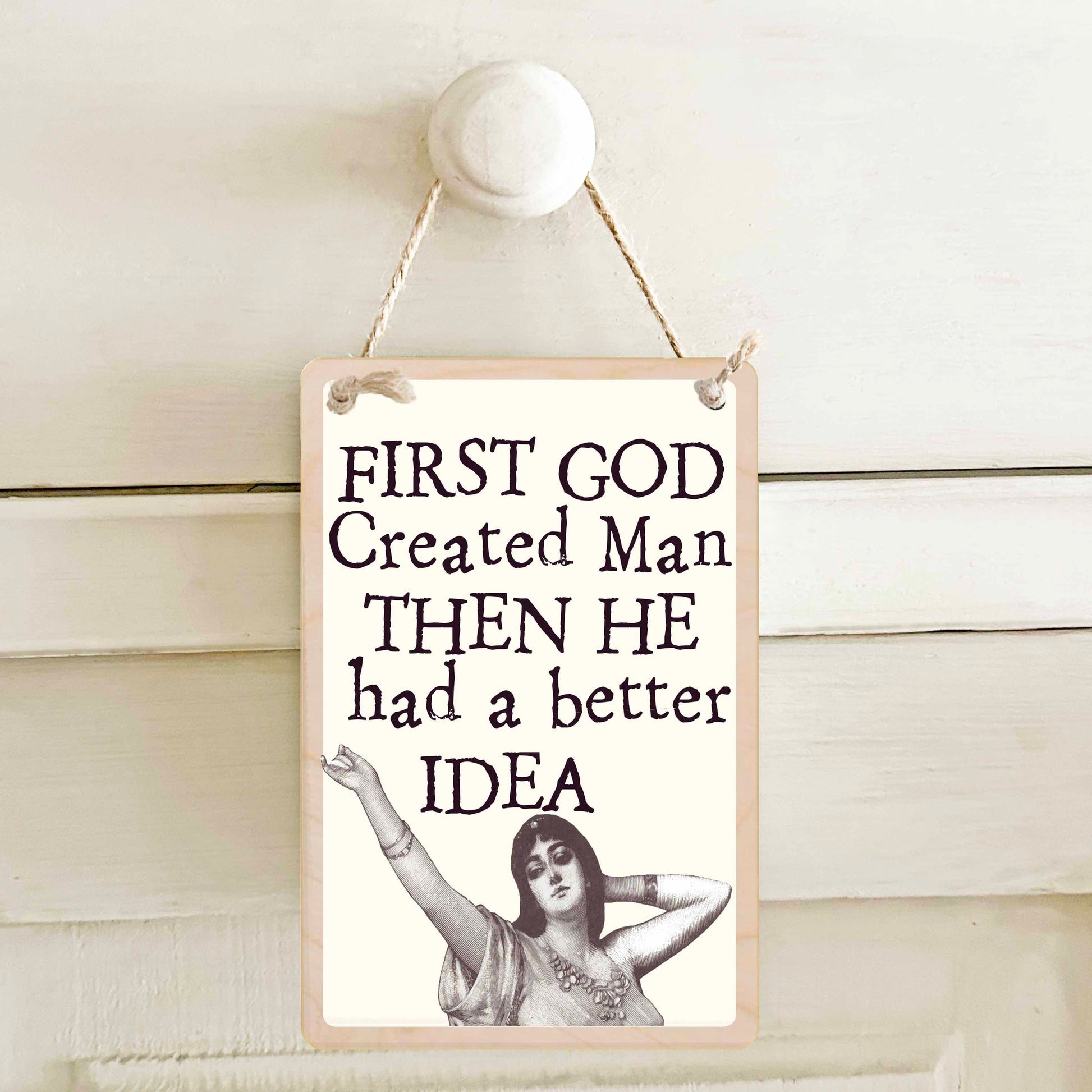 Wooden mini sign with old-fashioned twine for hanging in place.