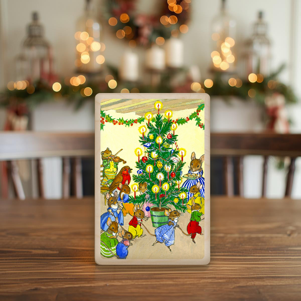 Original vintage Christmas illustration printed on sustainable wood. A beautiful card to send, display, or tuck into a stocking.