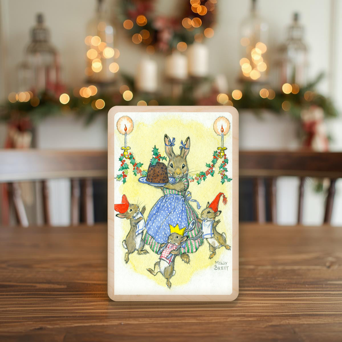 Original vintage Christmas illustration printed on sustainable wood. A beautiful card to send, display, or tuck into a stocking.