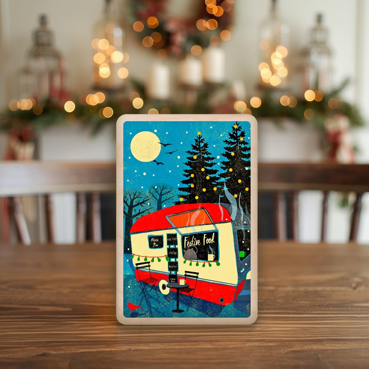 Original Christmas illustration printed on sustainable wood. A beautiful card to send, display, or tuck into a stocking.