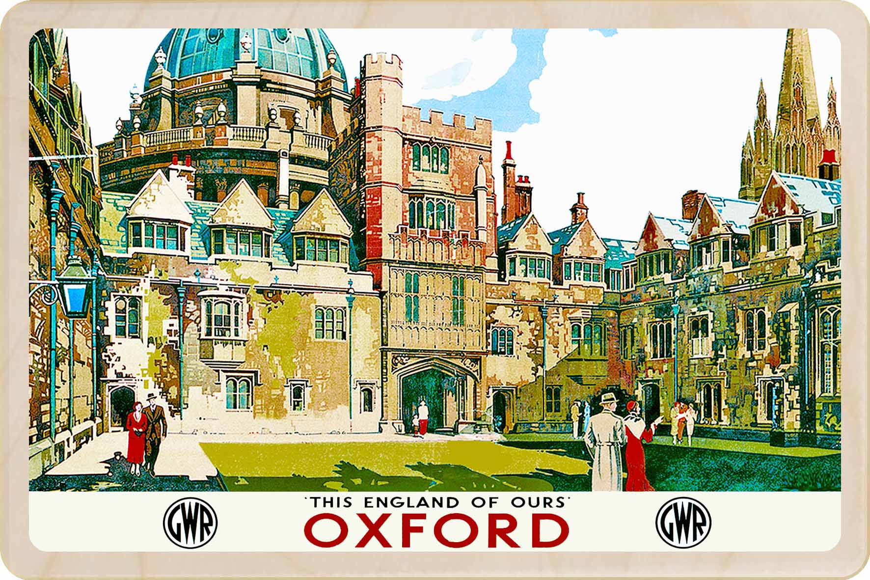 Oxford - Wooden Postcard featuring an original vintage travel poster from ©National Railway Museum / SCMG. Printed in high-quality colour on sustainably sourced wood. Ideal as a unique gift, keepsake, or souvenir.