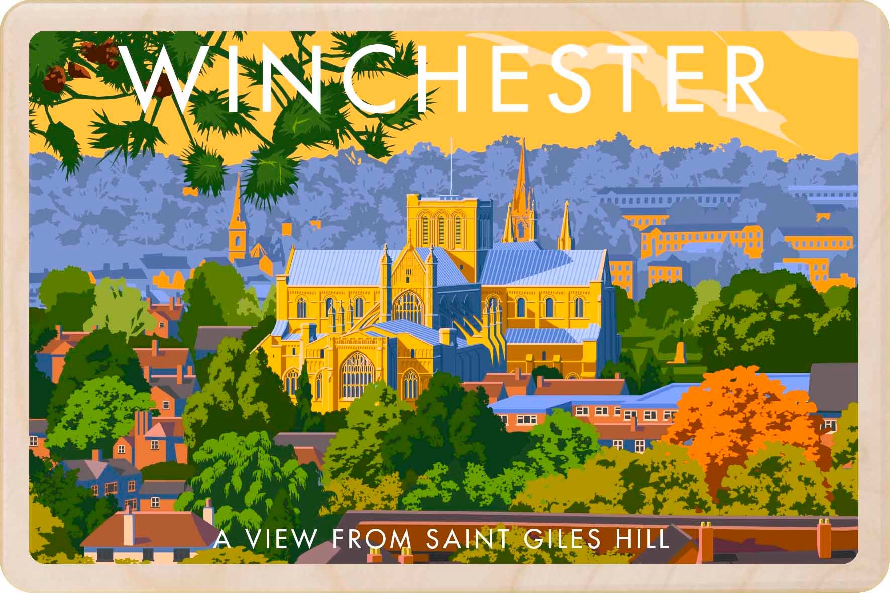 Winchester – Original illustration by Stephen Millership, printed in Suffolk on sustainable wood. A durable and display-worthy postcard—ideal to send, gift or collect.
