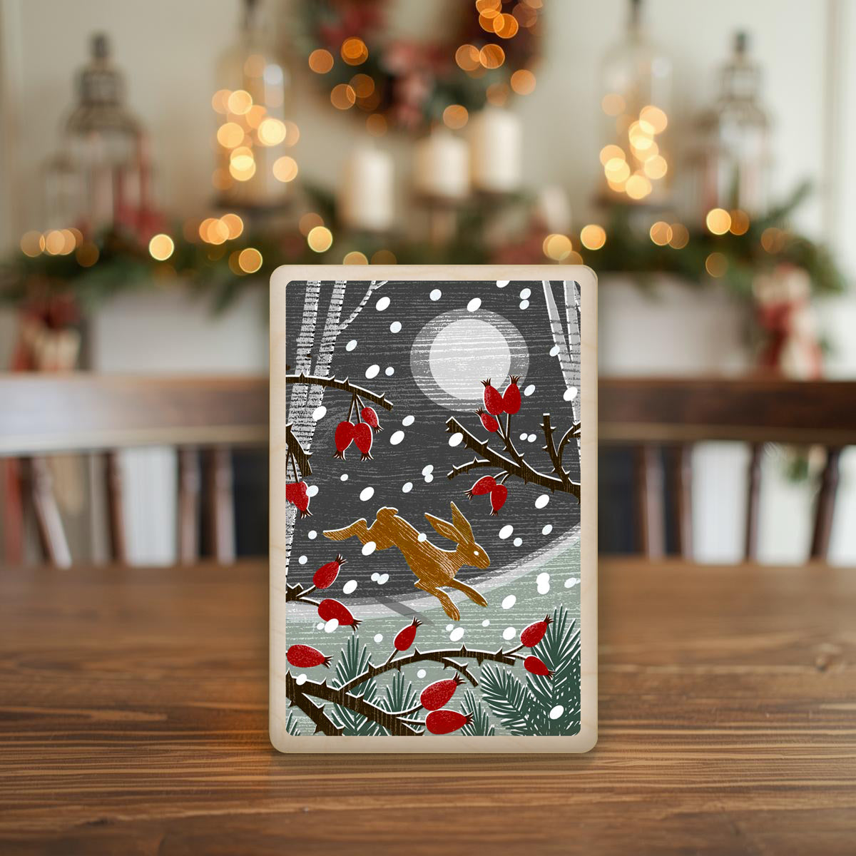 Original Christmas illustration printed on sustainable wood. A beautiful card to send, display, or tuck into a stocking.